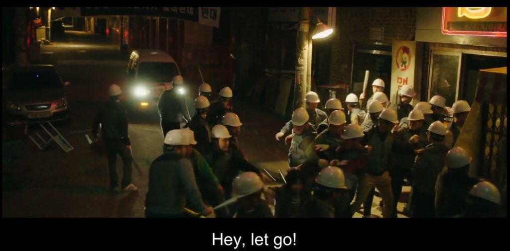 Las sublevaciones callejeras y los follones contra la policía deben ser algo habitual en Corea del Sur. Menudos equipos antidisturbios, pegan ostias al por mayor. Si hacen aquí como en la peli, plantando maquinaria pesada para aventar algaradas, arde el Parlamento pidiendo alternativamente la cabeza del ministro de Interior, del jefe de la oposición y de un par de ujieres que pasaban por delante. Allí debe ser parte del pintoresco sabor local, y los disturbiantes y antidisturbios ejercen sus poderes contundentemente por ambas partes en la vida real.
