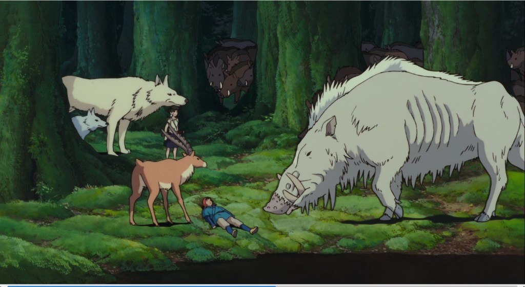 La verdad es que la primera impresión del protagonista (el príncipe Ashitaka) con su amor no es para los de corazón delicado. Encontrarte conque la princesa del cuento no es una arrebolada damita bordando en su torre, sino una asalvajinada niña de las monjas en versión lupina, con la boca llena de sangre…y aun así encontrarla bella y prendarte como un becerrico… vamos, enamorarte como se enamoran estos héroes, que se dejan la vida para sacarlas del lío pero son incapaces de un detallito, no sé… tomarla de la manita, regalarle flores y bombones, hacerle promesas que no se van a cumplir…