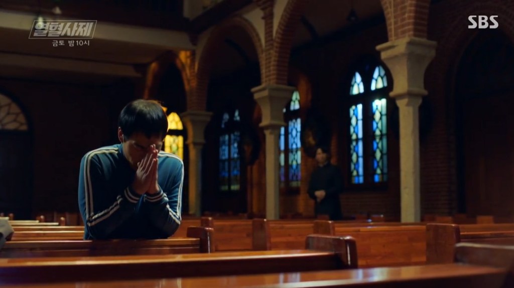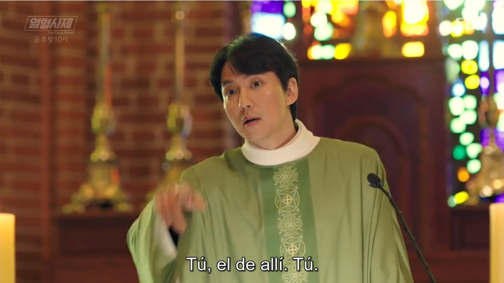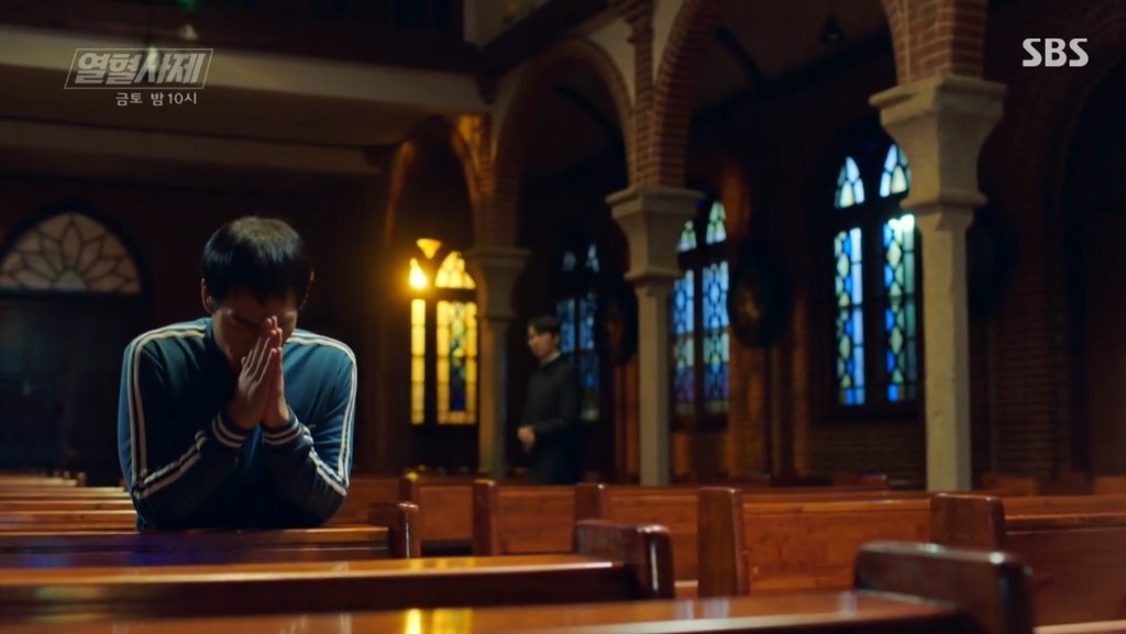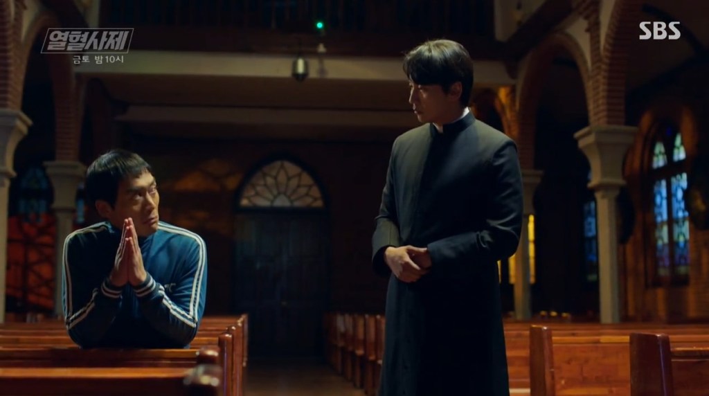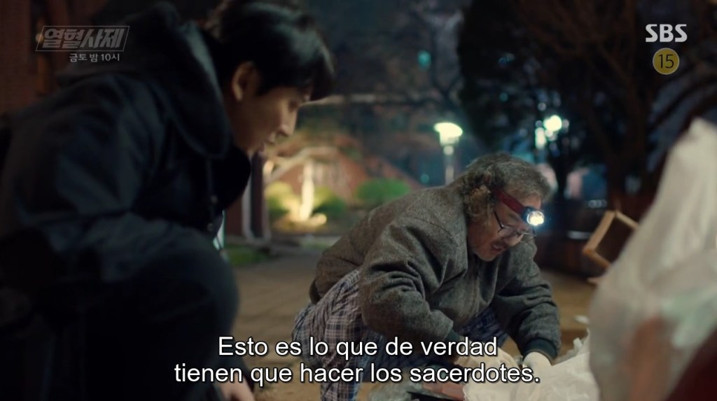 El eje central gira en torno a un sacerdote católico con un duro pasado (Kim Nam Gil hace un fabuloso trabajo), trasladado a la parroquia donde ejerce el veterano sacerdote que le rescató del cenagal vital donde chapoteaba, y es asesinado por los malos. Que el cura reciclado es un elemento de cuidado queda claro desde el primer momento: fustigo de malvados, látigo de abusones, apalizador de corruptos…no se conforma con homilías ariscas, que vaaaaaaa; este es de los que, entre predicar y dar trigo, lo que dan son guantazos a mano plena. Que no me toquéis a mis pobres, mis enfermos, mis huérfanos, mis parias, mi famélica legión; me quitaré la comida de la boca para alimentarlos, sangraré y dejaré que me rompan los huesos para protegerlos, porque yo no he venido aquí a traer paz y componendas, sino a levantar la espada y luchar por ellos. Unos lo hacen por el método de la resistencia pasiva (simplemente negándose a aceptar los cambalaches, y subidos al monte con el diablo susurrando “todo esto será tuyo” en la oreja, resisten la tentación, aceptan la amarga copa y sufren el martirio) y otros retoman las armas que un día abandonaron, sean cartas, sean disciplinas o sean artes dramáticas… Cuando todos les abandonen (incluidas las propias jerarquías eclesiásticas, demasiado preocupadas por el qué dirán, vamos, que quedan retratados), un puñado de valientes (y raros, porque son raros de narices) quedarán de pie y aguantarán como el último bastión de la dignidad, defendiendo el honor de un sacerdote, el futuro de un orfanato y la verdad del ejemplo… que ya está bien de sacrificar sin pudor a los soldados de infantería en el ajedrez de la sinvergonzonería de altos vuelos.