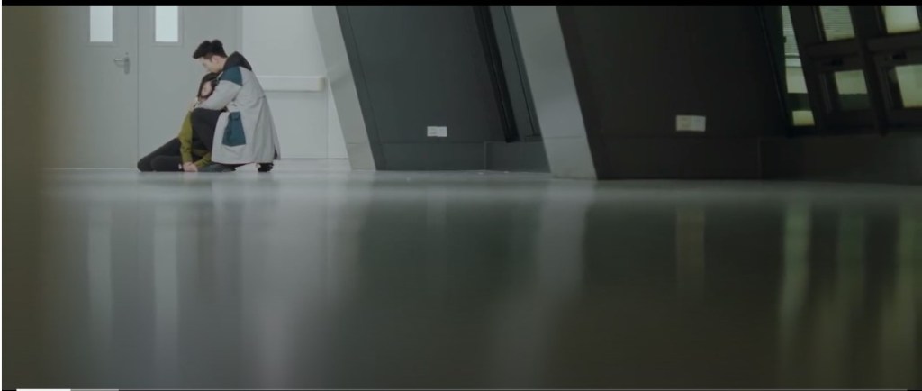 De esta última serie, técnicamente bien resuelta toda ella, analizamos una toma para instrucción de lectores: la pareja objeto de interés se sitúa en un lado de la escena, casi escapándose por el ángulo superior, y las diagonales los enmarcan apuntan a ellos. El entorno frío y duro refuerza la idea de dolor concentrado, el aislamiento en el cual sólo se tienen el uno al otro, y las dos figuras (con apenas unos detalles de color en la ropa para verse en el monocromático pasillo) se envuelven la una a la otra buscando el consuelo y formando un pequeño triángulo que a su vez en caja con el resto de triángulos
