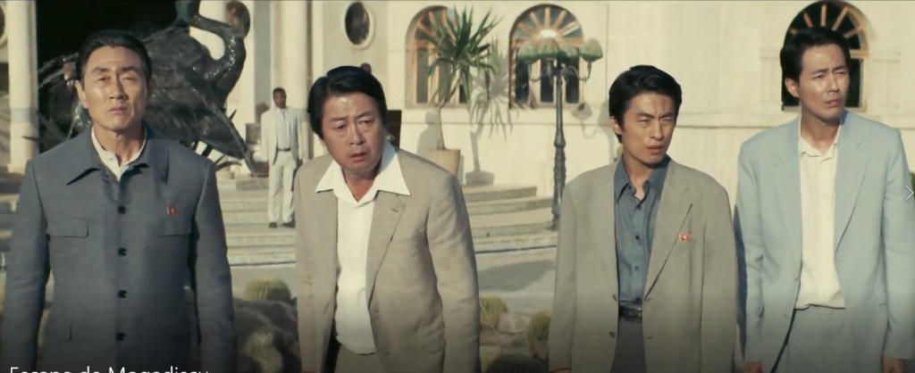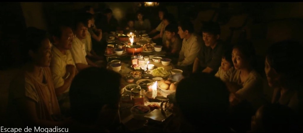 Etiqueta gorda al principio: “basada en hechos reales”. Si, basada pero no es exacta. Muchas cosas han cambiado al pasarla al guion, y otras se conservan intactas. Que en enero de 1990 la guerra civil llegó a la capital en Somalia, es verdad. Que se asaltaron las empajadas y Mogadiscio se convirtió en el Infierno que nos pintaba el Bosco, pero sin metáforas con monstruitos divertidos, también. Que las hordas de adolescentes y niños drogados fueron “lo normal” y más destructor, también. Y que el personal de las dos embajadas de países a su vez en guerra (de hecho, todavía no han firmado la paz) tuvo que hacer una asociación temporal para salir vivos de la catástrofe, también. El cómo se desarrolló la historia en los detalles ya es cosa del guionista. Fue el embajador del Sur el que, al encontrarse en el aeropuerto al principio de la crisis con el grupo del Norte y visto que ya no salían vuelos, ofreció su embajada como refugio, a lo cual los norcoreanos se negaron (ya sabemos el porqué). La embajada norcoreana había sido asaltada no una sino ocho veces, y ya sabían que la siguiente vez los matarían a todos. Que cuando llegaron pidiendo posada, no venían con las manos vacías, y en las cuatro noches que pasaron juntos (no una como en la película), juntos cocinaron y comieron el arroz que los invitados a la fuerza habían podido esconder y aportar. Porque cuando se activa el programa de supervivencia de ser humano, volvemos a los comportamientos de la Tribu del Oso Cavernario: las mujeres se reúnen, cocinan juntas y cuidan de los niños, y los hombres vigilan el entorno y hacen planes de cómo salir del asunto con el pellejo entero. Os recomiendo que primero os veáis la película, mantita y chocolate en la mano, y luego os leáis las puntualizaciones del embajador surcoreano que relata sus memorias. Por cierto, que sigue sin haber embajador surcoreano en ese país africano (ahem, país por llamarlo algo…). Y si aun tenéis tripas, echad un ojo al polaco y su opinion sobre Africa y sus demonios