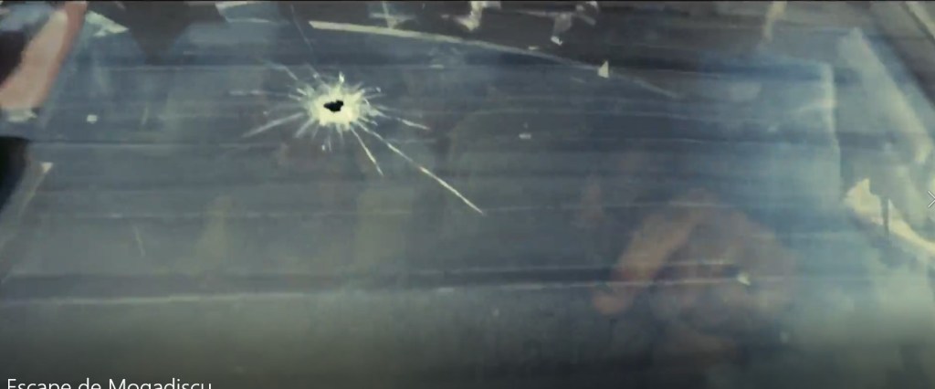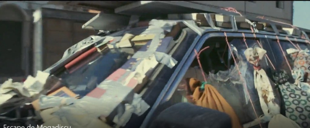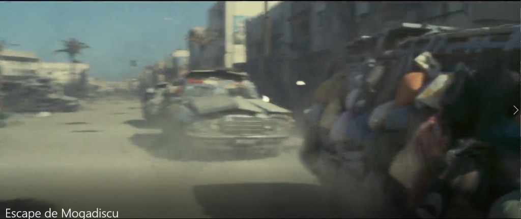 Aquí ya la cosa se viene arriba, arriba. Versión moderna de la Diligencia, que sólo les faltan los indios con los caballos y las flechas ardiendo. Los coches aguantan la escapada estupendamente (quiero decir que llegan hasta su destino), la puerta de la embajada. Ya no os cuento cómo acaba, que luego decís que os hago spoilers y esta película es muy reciente (del 2021). Rodada en Marruecos, concretamente en Essaouira (no consiguieron permisos ni garantías para hacerlo en escenarios originales, y ademas los surcoreanos tiene prohibido viajar a Somalia) y candidata al Oscar, es una gran producción de buenos recursos técnicos, medios a tutiplén, montones de extras (300, que no está nada mal, hablando en mas de cinco idiomas), con fotografía que alterna entre la luz brillante y clara de la ciudad al sol (con un filtro de etalonaje amarillo, esquivando los etalonajes extra cálidos calabaza del cine americano, que en cuanto baja del paralelo 35 mete el filtro naranja a tope a todas horas) y la iluminación de la noche, que (esta sí de forma realista) es amarillenta y anaranjada, oscilante y difusa, con espesas sombras y luz de las hogueras reflejada en los blancos muros de las calles devastadas o la luz de las bombillas y las velas de interiores. Bueno, lo de los millones de balas en las persecuciones no es muy realista, pero mola…Y lo de usar coches tuneados con bolsas de tierra, libros y madreras se lo tuvo que inventar el director para justificar que consiguieran hacer la carrera Mad Max sin acabar todos fritos en la primera descarga de subfusil…. A ver, que yo lo entiendo: te vas a 11. 000 km de tu casa a todar tres meses, metido todo el equipo en el hotel, te llevas contenedores enteros de atrezzo, maqueas una ciudad entera como si fuera otra, tienes a chorrocientos tipos (casi todos negros como el betún) mirándote con cara de besugo y con montones de armas en el set, efectos especiales en pleno delirio bélico, los cámaras e iluminadores en permanente estado de crisis y epifanía…. Y si metes menos de 20.000 disparos en la acción, asúmelo, eres un fracasado. Con el asunto de “blindar” los coches, además de hacer mas efectista la escena (con bolsas oscilando y libros cayendo y trozo de puerta que salen volando) es que así te crees un poco lo de sobrevivir a la tremenda balacera. Pero como dice el director, el relato original fue tan alucinante que parece imposible