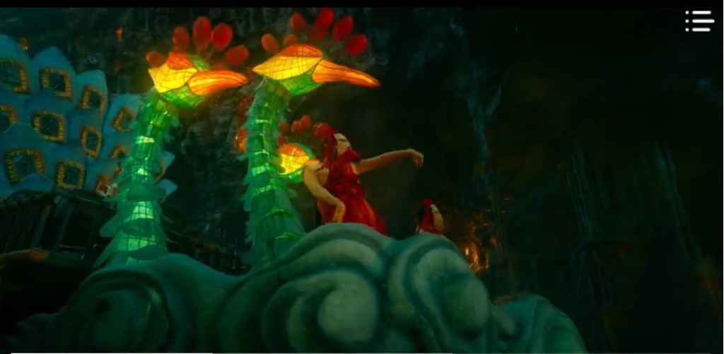 Sorbito al tazón de chocolate y a disfrutar de las imágenes, si no os da una conjuntivitis con el etalonado, claro… igual cuando lleguéis al reino de Ranliang tenéis que bajar la saturación del monitor para evitar sentir que os habéis comido el ficus del salón confundido con las galletas de jengibre y estáis sufriendo un efecto secundario. Planos rápidos y tremendamente saturados, con unos filtros de color aplicados al 300%, y todos los trucos conocidos para esconder los posibles fallos del CGI. Mucho han tenido que currarse los actores el poder rodar aguantando el tipo en la pantalla verde sin morirse de risa, confiando ciegamente en la magia de los tipos con ordenadores.