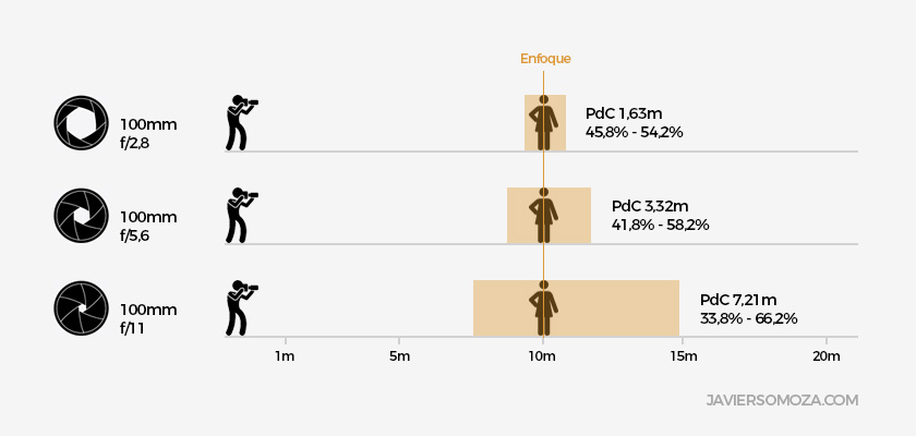 Profundidad de Campo: es la distancia en la que los objetos o sujetos de la escena están enfocados y se perciben nítidos. Normalmente en cine se prefiere una profundidad de campo reducida (por delante y por detrás, sobre todo por detrás) para que lo que queremos resaltar quede separado del fondo (que a veces no es interesante, y llega a estorbar). Para eso se utilizan focales muy cortas, casi “gran angular”, y el actor tiene que saber muy bien por dónde se mueve el personaje en el escenario para no salirse de “su zona” llevado por la emoción del momento. En cambio, si el paisaje o el fondo o el escenario (una habitación, un bar, una granja…) también es importante en la escena, se eligen profundidades mas amplias para que podamos verlo con claridad