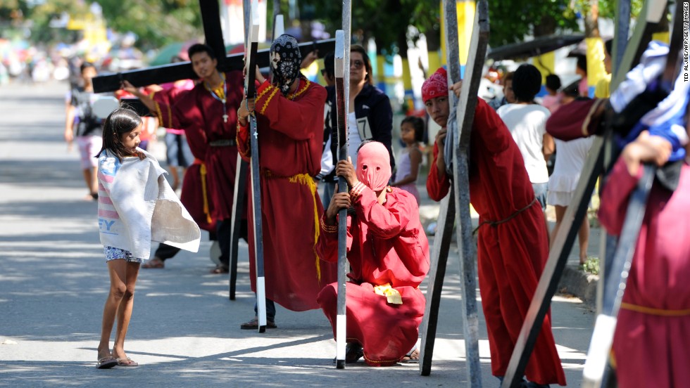 Filipinas: Aquí si, aquí se han ido al otro extremo. Ya desde los tiempos de su pertenencia a la corona española en el siglo XVIII se realizaban procesiones sin faltarles un detalle, con penitentes, pasos, cristos, cruces guía, monaguillos pizpiretos… menos nazarenos, de todo había. Con abundante color local y su particular manera de adorar las imágenes (mayormente, subiéndose a los transportes y achuchando a los cristos como si fueran amigotes de farra). Actualmente, no sólo hay una evidente exhibición de los ritos y la profesión de la fe -con procesiones multitudinarias y que dejan pequeños los follones del Rocío sevillano-, sino que en los años 50 empezaron a hacer representaciones teatralizadas de la Pasión al estilo Cervera, Senaluko (con la variante Pabása, en la cual se hace una representación cantada y bailada). Les gustó tanto, tanto, tanto lo de “en vivo y en directo” que en 1962 crucificaron de verdad a un voluntario. Bueno, matarlo, matarlo, no se lo cargaron, porque no tenían la certeza de su resurrección el domingo. Desde entonces todos los años hay voluntarios (también mujeres) que se apuntan a lo de sufrir algunos o todos de los martirios de Cristo, incluyendo lo de clavarlo en la cruz. Y alguno ha repetido, aunque el mas longevo dice que casi mejor piensen en irlo sustituyendo porque ya se ve muy mayor. La Iglesia oficial se espanta, los obispos se tiran de los pelos, los encargados de la salud pública entran en crisis de nervios… pero cada vez hay mas gente encantada con el asunto. Para los turistas que venimos de fuera es algo entre la fascinación y el morbo (“esageraos son por allí, pero que buenas foticos tengo”) pero allí se lo toman MUY en serio. Apostaría doble contra sencillo a que es un tema que tiene que ver con algún ritual ancestral que ha resurgido al olor del incienso