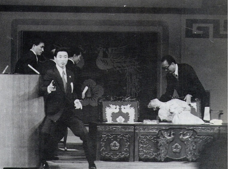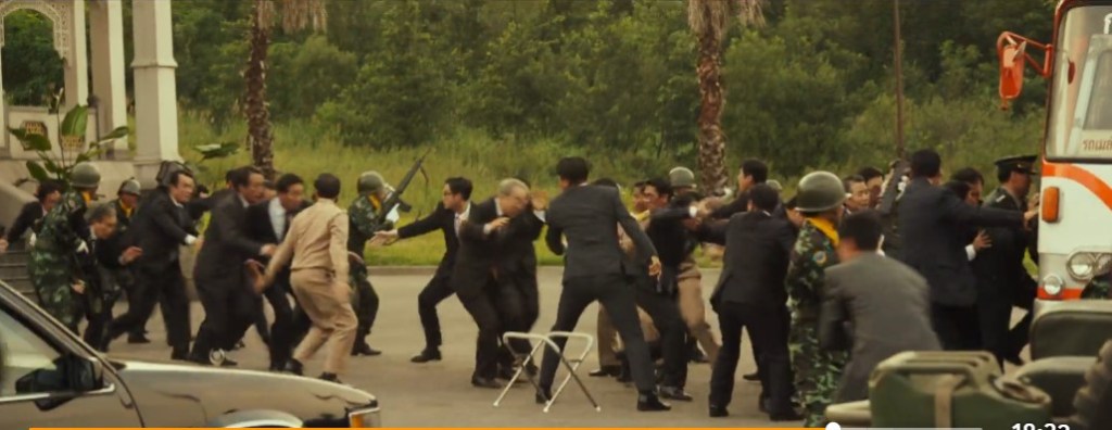No solo los infelices de las clases medias y bajas “reclutados por los enemigos del país, malditos commies” intentaban cazar al presidente. Desde dentro del propio Ejército y agencias organizaron jaleos. Si, aunque alguien le reproche a la película que “es imposible que el presidente sobreviviera a semejante ensalada de tiros”, eso es precisamente lo que pasó en Rangún. Al final, fue el propio director de la ACIC y jefe de seguridad del presidente, Kim Jae-gyu, el que aprovechando el ambiente relajado de una cena en la Casa Azul se sacó la pistola y le pegó dos tiros a bocajarro, sin que quede claro si estaba premeditado, fue un calentón o simplemente llevaba rumiándolo desde tiempo atrás y ese día le vino bien. Ni siquiera parece que fuera un magnicidio en respuesta a su gobierno o sólo un asunto de rabia personal por las críticas a su trabajo. La cosa es que ahí quedó, con los sesos encima del tatami, el interfecto