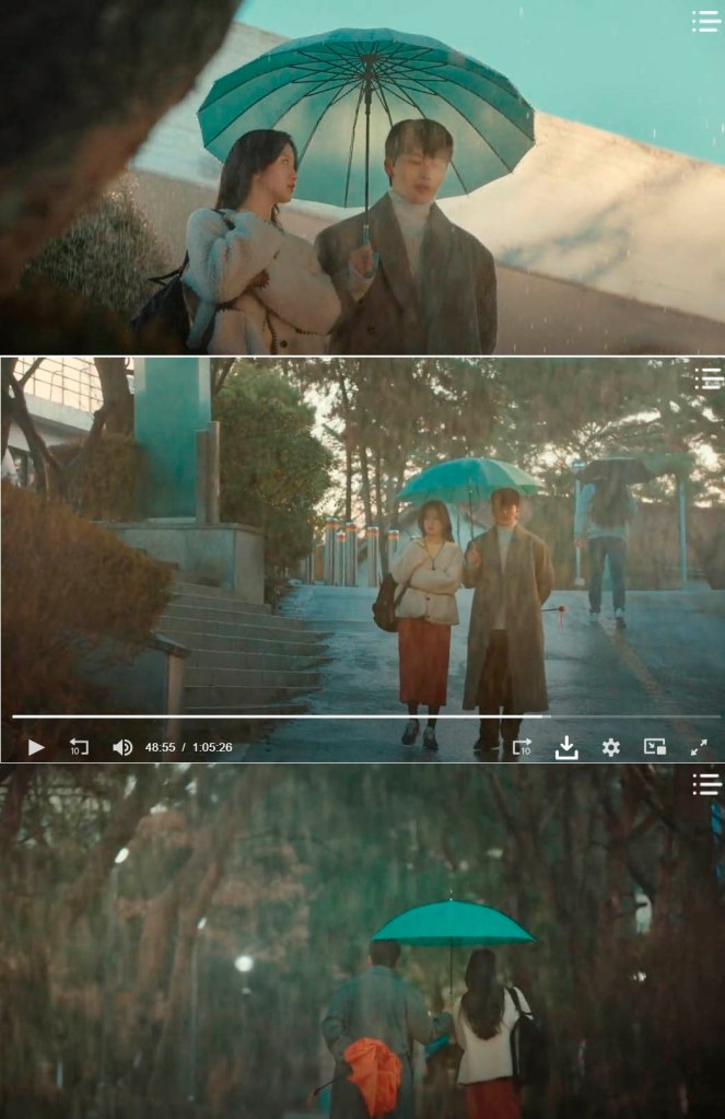 Cuando se planea una escena, hay que pensar no sólo en cómo se van a mover los personajes, sino tambien en los colores que se desplazan. Cualquiera de las tres imágenes es una delicia (toda la serie está en manos del encargado de fotografía), pero la serie de tres en la secuencia (el tropo del chubasco y el paraguas) se mueve con una suavidad exquisita. Arriba, una toma en contrapicado con el paraguas turquesa que trasluce y gotitas de agua como joyas, en una composición equilibrada y la paleta de azules empastada con esa lluvia a cuenta del departamento de atrezzo con el camión manguera (je, que se ve el cielo azul, la luz es demasiado brillante y las sombras bien definidas para creernos que sea natural). En la siguiente, aparece el color naranja medio en la falda de la chica para completar el etalonaje Orange-Blue tan de moda. El color turquesa se repite en la columna que a la izquierda completa la composición. La figura de la persona que corretea en el fondo ha animado el cuadro, que juega con los reflejos del suelo mojado. Y en la tercera, aparece el segundo objeto naranja, bien destacado sobre la ropa oscura y modesta del protagonista: el paraguas roto (a su vez referencia de otra escena en un flashback) que atrae nuestra vista mientras la pareja se aleja por esa avenida de árboles borrosos, perfectamente colocado en la misma parte de la imagen que en el plano anterior para hacer una continuidad de ángulo. Toma ya, tan sencilo y tan delicado como los emplatados del chef