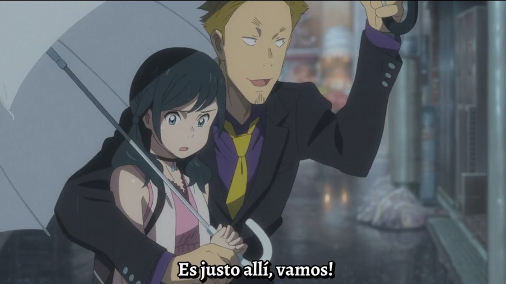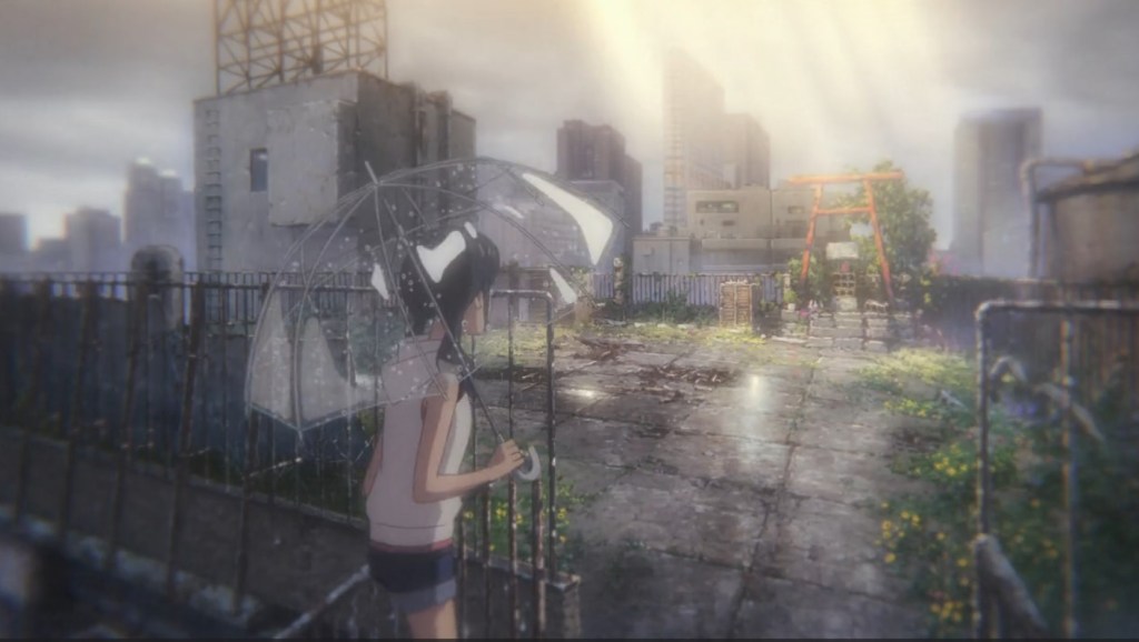 Uy, pero resulta que la chica tiene un superpoder: si se acerca a cierto torii (la puerta roja del sintoísmo) que hay en un tejado de la parte abandonada y reza, es capaz de detener la lluvia.
