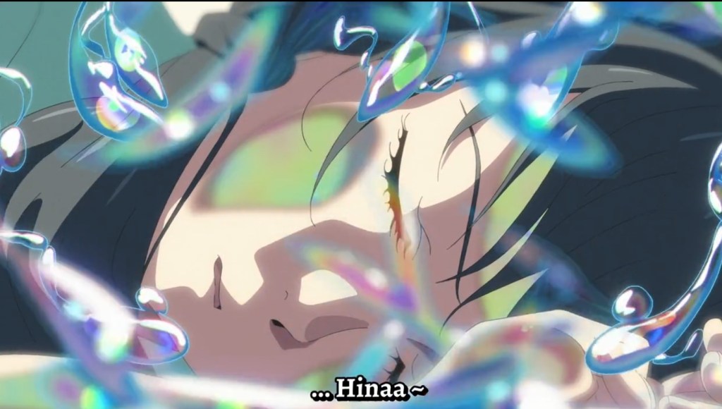 Tanto éxito tiene el negocio que acaban saliendo en la tele, y se acabó el anonimato. Los mafiosos por un lado y la policía por otro los persiguen. Hay que salir pitando. Durante la huída, la chica-sol le confiesa un secreto al chico-defensor: cuanto mas reza, mas transparente se vuelve. La culpa de todo el lío con el clima es que ella se tiene que ofrecer como sacrificio humano, y hasta ahora se ha resistido a ser ofrenda en el altar (cuarta tesis: los adolescentes se sienten responsables de TODO lo malo que ocurre a su alrededor). No os cuento mas para no destriparos la historia.