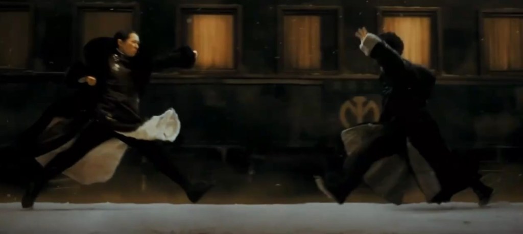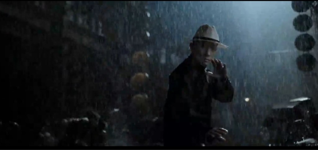 Con un Tony Leung demostrando que por algo es un actor reconocidísimo e internacional (encima habla varios idiomas, perfecto para entrar en producciones internacionales… pero no le sale de las narices rebajarse a hacer el chino de relleno en las producciones de Hollywood) y cuando le apetece, cantante. Zhang Zi Yi se ocupa de la hija peleona, que ya tenia experiencia en eso de andar dando patadas con cara de ajo porro (Tigre y Dragón, la Casa de las Dagas Voladoras, anda que no nos quedamos ojipláticos los occidentales en aquellos primeros años de rodar con alambres) y de sufrir mucho en kimono: protagonizó la versión en película de Historia de una Geisha, que aquí fue poco apreciada y allí levantó ampollas porque la actriz principal no era japonesa. El malote perverso, Zhang Jin, es un antiguo atleta de wushu, y empezando por ser el doblador en películas de artes marciales pasó a protagonizarlas. La parte de fotografía (como digo, espectacular) está a cargo de Philippe Le Sourd, que lo ha bordado. De rodillas, ignaros, De.Ro.Di.Llas. Lo cierto es que lo ves y dices porras, me suena… claro, me suena a Matrix: Han copiado el aspecto visual y la ambientación con sus peleas con cámara lenta, el regodeo en los detalles, la lluvia que ayuda a esconder los trucos de los efectos especiales… Se ha juntado con este director, y se han dedicado a hacer una joyita