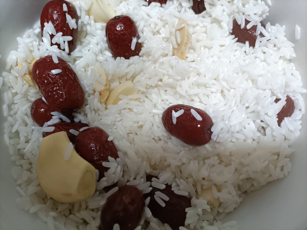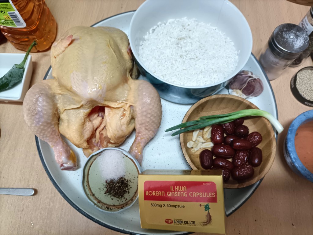 Lo primero, recopilación de ingredientes para cocer el animalito: un pollito limpio y vaciado, media taza de arroz glutinoso (que lavamos y dejamos en remojo con agua fría unas horas previas), dos raíces de ginseng (upppssss no había ni frescas ni secas… las sustituimos por dos cápsulas de ginseng en polvo coreano que había por casa), dos dátiles rojos secos (buenoooo… un puñadito, que estas cosas nos gustan), media cabeza de ajos pelada, una cucharadita de raíz de astrágalo, unas cebolletas (aquí tocó los rabos verdes de unas cebollas que habían germinado), sal, y pimienta molida,
