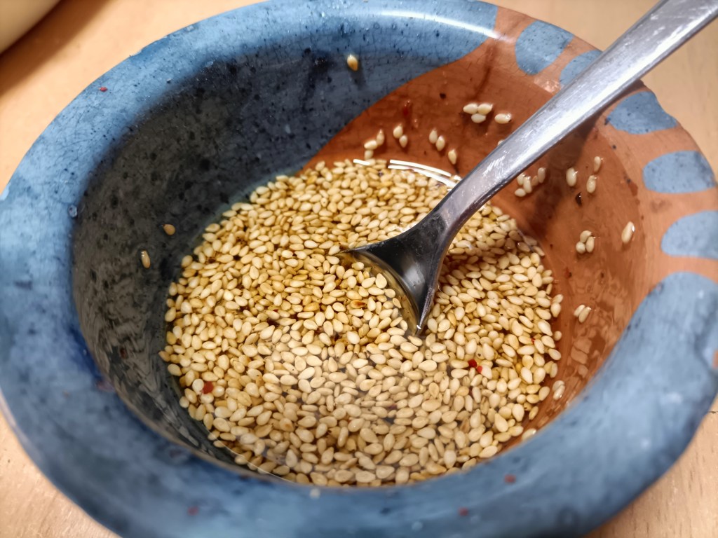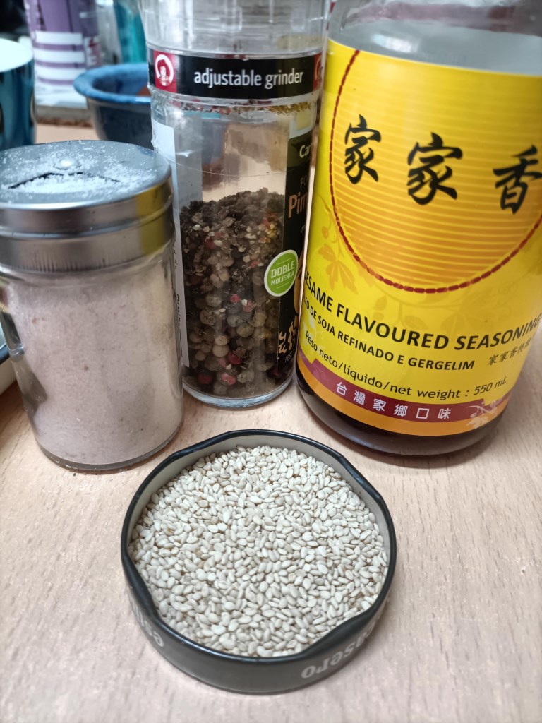 Para la salsa de sésamo: una cucharadita de sal, otra de sésamo tostado, un pellizco de pimienta negra, buen chorretón de aceite de sésamo