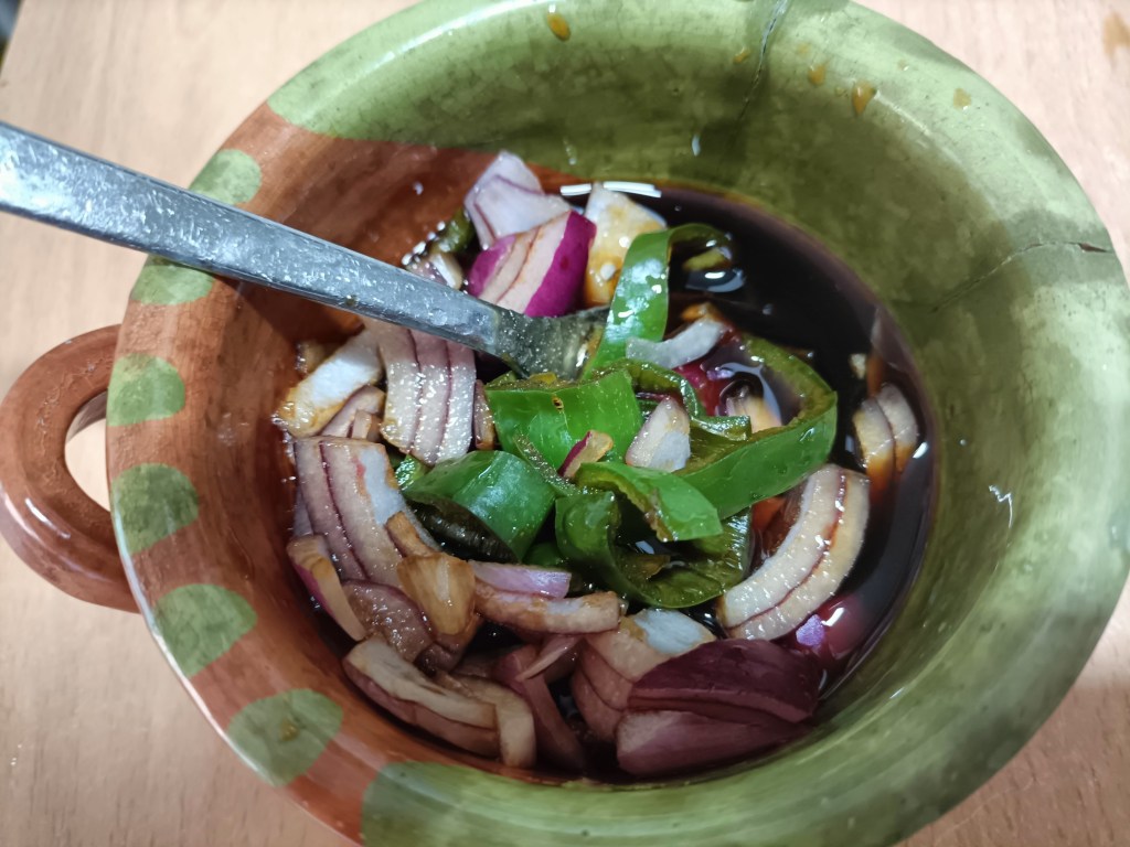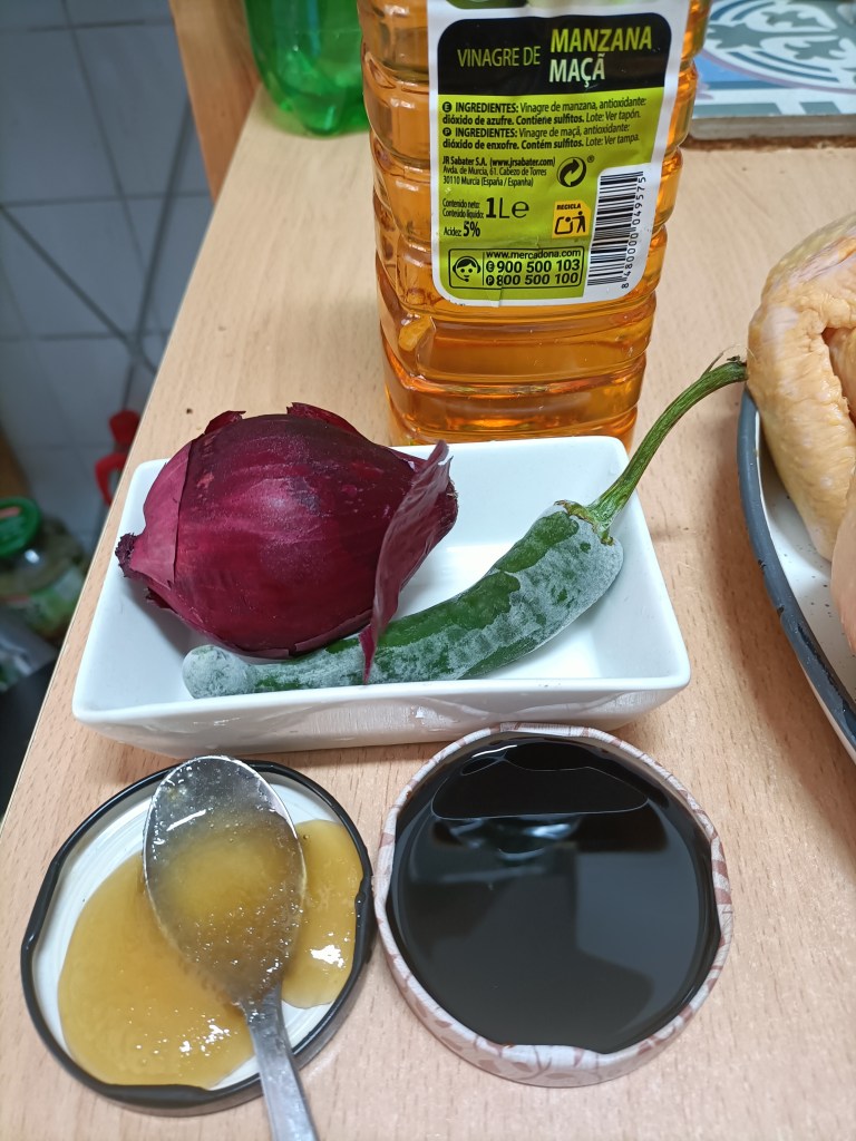 Para la salsa de soja agridulce: 3 cucharadas de salsa de soja, 2 cucharadas de vinagre blanco (o de manzana), una cucharadita de miel, media cebolleta en trozos y una guindilla fresca,