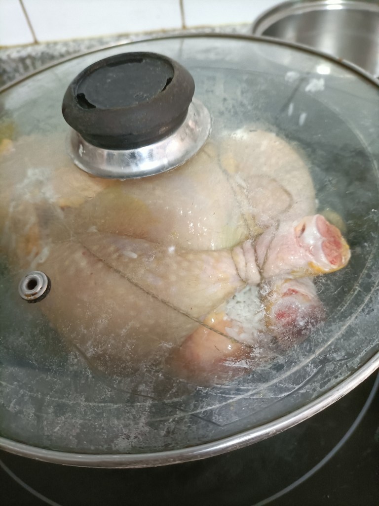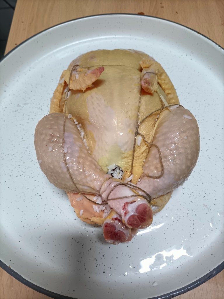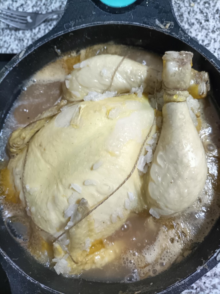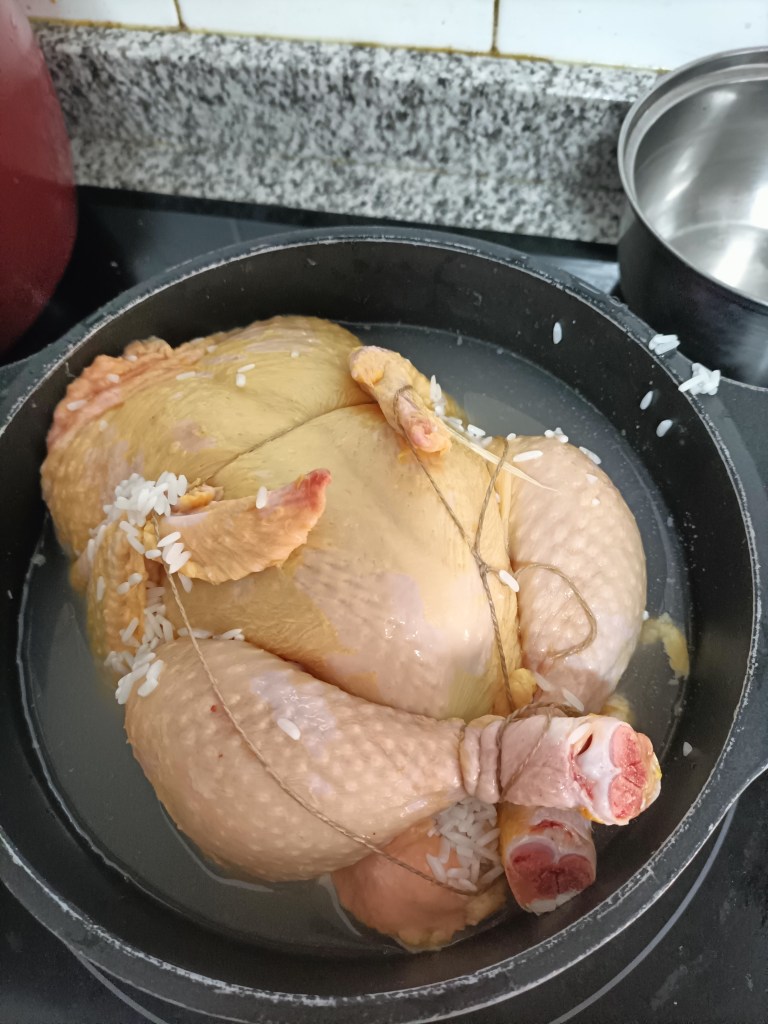 Rellenamos los pollos con la mezcla y, si tuviéramos la raíz de ginseng, también meteríamos un tozo por pieza. Cerramos los pollos con un cordel de hilo de cocina (o sea, los bridamos) para que no se escape el relleno y los ponemos en una olla con agua fría. Si sobra arroz del relleno, lo echamos también a la olla.