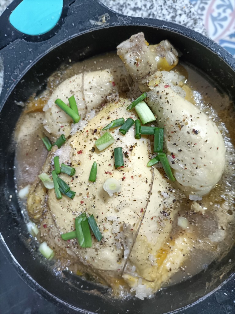 Para servir el pollo, se puede sacar la olleta a la mesa o poner el pollo con el caldo en un cuenco grande. Se adorna con la cebolleta picada por encima y si hay algún amante del picante, se le da un pase de pimienta negra molida.
