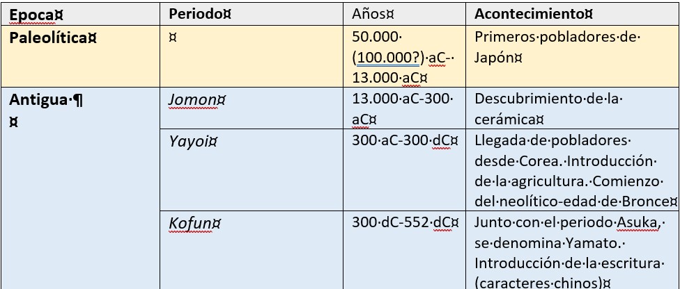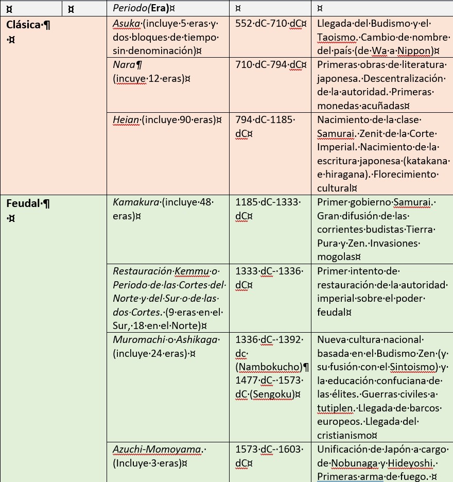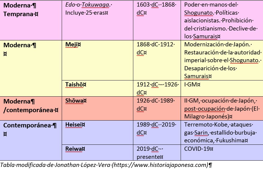 Podemos dividir la línea temporal desde el principio en época Paleolítica y Neolítica (o Antigua,con los Periodos Jomon, Yayoi y Kofun, que llegarían hasta la adopción de la escritura con la importación de los caracteres chinos) No sabemos cómo se organizarían en ese tiempo los historiadores (o mayormente, los recaudadores de impuestos), pero en el 701 d.C. el Emperador Kōtoku (645–654 d.C.) establece el sistema de las Eras para contar el tiempo. Asi dicho en plan básico, una Era es un periodo de tiempo con un lema básico que debería representarlo o identificarlo (年号, el nengō, literalmente, nombre del año), y que puede durar un número variable de años. Como lo del III Año Triufante, vaya… Para datar un acontecimiento se usa el nombre y el numeral del año; o sea, por ejemplo: Taika (大化)1 correspondería a la primera era a la que se asignó un nombre, y 1 se refiere al primer año, durante el cual la Emperatriz Kōgyoku abdica y su hermano el emperador Kōtoku asciende formalmente al trono y estrena el sistema