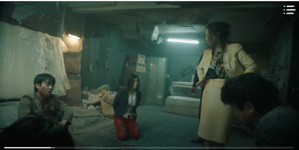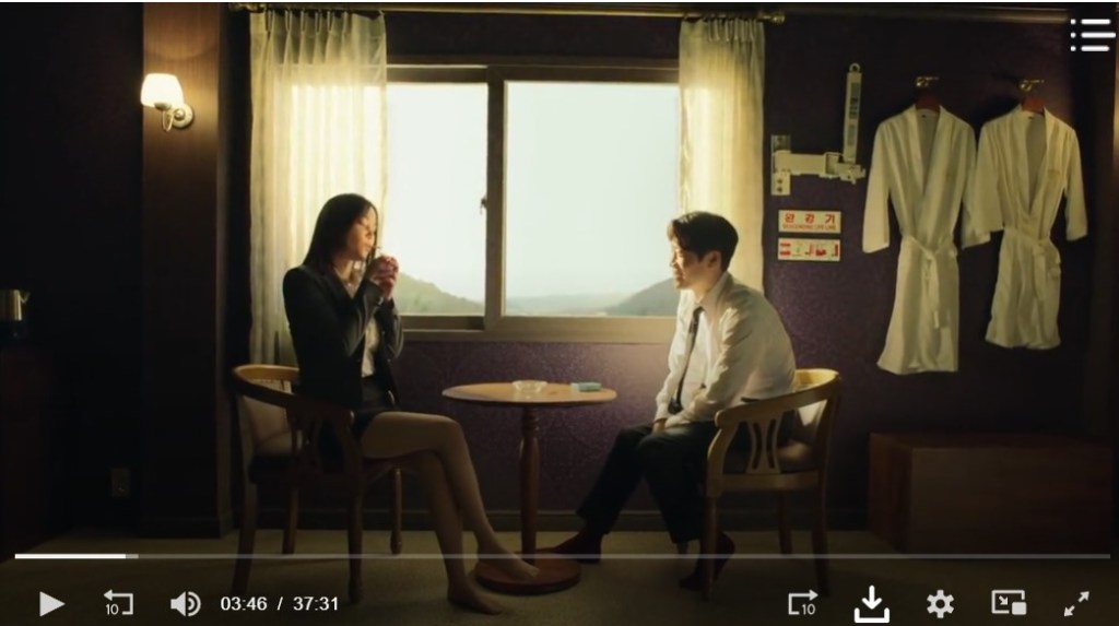 Todos los capítulos están rodados en un único plano-secuencia: Un tour de force de equipo técnico y actores, sin espacio para el error o el titubeo. En algún momento hacen empalmes para mover la cámara (p.e. saliendo y entrando del montacargas) pero aun así nos quedamos pillados pensando cómo se ha movido la cámara (y el cámara) en espacios tan cortos. Evidentemente, la planificación de cada plano y cada movimiento es crítico, y ha necesitado mucho trabajo de producción antes de dar claqueta. Las ópticas cortas (casi ojo de pez) aque obliga el espacio reducido y las deformaciones que producen en la imagen son parte de la historia, reforzando la idea de videojuego con los personajes correteando como muñequitos a un ritmo frenético. Otro punto llamativo es el actor Jin Sun-Kyu, que aceptó rodar toda la película en unos llamativos calzoncillos paqueteros rojos, pilla unas botas de goma y una gabardina solo a partir del segundo episodio y en general nos demuestra que el tipo está muy contento con su cuerpo y no tiene reparos en enseñarlo. ¿Qué si nos suena? Pues claro: fue padre del acupuntor, cazó zombies, rebuscó en la oscuridad, fue monje budista, tigre espacial, perverso norcoreano… esa nariz chata no tiene pérdida. Eh, que ojo que lo que le va mas es el musical. Jun Jong-Seo acaba de empezar, y Chang Ryul, aunque tiene algo mas de CV (es que lo suyo es el teatro), no lo tenemos visto por aquí. Los tres están fenomenales.