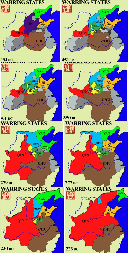 Al principio de este período, el estado de Jin era el que llevaba la voz cantante, pero se va deteriorando , las luchas por el poder y las alianzas con otros estados para conseguir como-sea-y-pase-lo-que-pase sentarse en el trono (uy como me suena esto) acaba destruyendo la fortaleza de Jin, que acaba repartido en manos de distintas facciones: Han, Zhao y Wei. A partir de ahí todos se tiran al cuello de todos. Alianzas y traiciones se suceden. En el 316 a. C., Qin conquista el área del reino Shu, y sigue merendándose cada uno de los otros estados, (acabando en el 221 a. C. con Qi), completando así la unificación de China e iniciando la dinastía Qin.