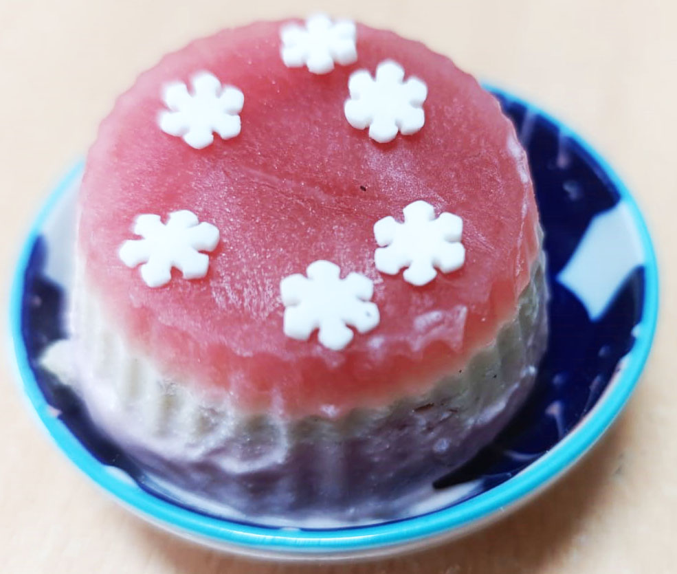 Para el montaje, le he puesto unos trozos de oblea en el fondo del platillo donde lo presentaré, y al desmoldar unos copos de azúcar de esos que venden en la sección de confitería.