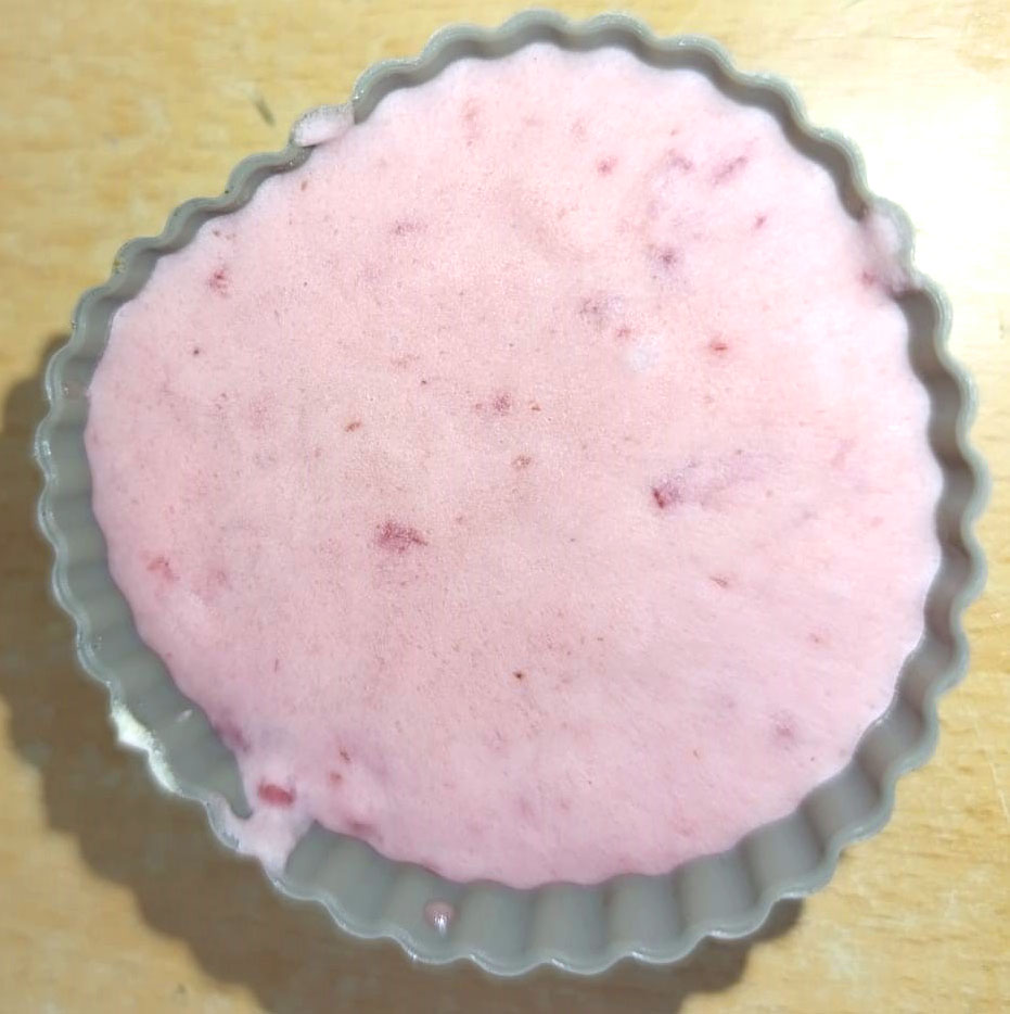 Lo primero es montar un couli con gelatina, que irá en el fondo. Mezclas 200 gr de mermelada de cereza (de buena calidad, con muuucha proporción de fruta) con un tercio de cucharada de maicena y un vasito de agua, y lo pones a calentar con fuego muy suave. Cuando esté caliente, le añades la punta de un cuchillo de polvo de agar-agar. -Este tipo de gelatina de origen vegetal (viene del alga tengusa) resiste bien el uso con productos ácidos como trozos de fruta, pero tiene que activarse con calor, por eso se añade a las preparaciones antes de cocinarlas. Por seguridad, la prefiero si estoy trasteando una receta que no conozco su acidez, la gelatina cuajará sí o sí-. Le metes un meneíto y cuando empiece a pillar consistencia la retiras del fuego la cuelas y le añades una cucharada de vodka o sake (VO: 150 gr de puré de cereza, 30 gr de azúcar, 6 gr de maicena, 2 gr de gelatina en láminas, 10 gr de ginebra japonesa; hidratas la gelatina, calientas el pure, el azúcar y la maicena a fuego suave hasta que haya espesado, retiras del fuego y añades la gelatina escurrida y la ginebra). En el fondo de los moldes pones una primera capa de este couli, dejas enfriar, y cuando esté a temperatura ambiente lo metes en el congelador (aunque si has usado agar-agar, cuaja en el frigo estupendamente o incluso en la encimera de la cocina)