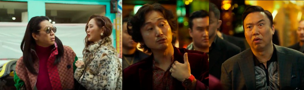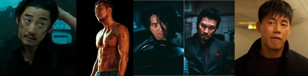 Los actores… pues muy bien, empezando por el primer malo, el chino calmado y terrorífico (Yoon Kye-Sang, un idol reciclado que estuvo poseyendo gente); el segundo, el empresario asesino (Son Suk Ku, que ha hecho teatro y tele y se ha metido en dirección de arte y director de cortos, y estuvo fenomenal como turbio policía y cazando desertores); el tercero, el niñato insoportable (Lee Joon Hyuk, que fue principito) asociado al yakuza feroz (Aoki Munetaka, que despues ha estado cazando a Godzilla y tiene un buen CV); el cuarto, el matón paciente (Kim Mu Yeol, que antes coincidió con el protagonista en campos cambiados). Y el protagonista absoluto, el number one, nuestro Bud Spencer comedor de kimchi… ¡Ma Dong Seok, el único, el inigualable, el que mejores guantadas a mano abierta sacude! En las dos últimas películas de la saga ha sido productor ejecutivo (sobre todo ponen recursos, contactos y llamadas telefónicas) y suponemos que repetirá función en las próximas cuatro películas del Monster Cop que anuncia; viene de cazar cocodrilos postapocalípticos, va a repetir en nuevas películas como Dios de la Casa… por cierto ¿sabíais que de jovencito estuvo viviendo en Ohio? Por eso habla ingles perfectamente y ha trabajado en los engendros de la Marvel…no me joas, la de Eternals, que manera de desaprovechar a este pedazo actor y entrenador de Artes Marciales Mixtas (MMA). Y repiten en la fiesta Kim Young Woong (a este le hemos visto uffffff montoooones de veces y en todas triunfa), Kwak Ja Hyung (otro tipo de muecas y guiños) y Park Ji Hwan (tambien le conocemos, si si…). Vale, muchos de los actores han coincidido repetidas veces aqui y allá, os divertiréis localizando caras conocidas