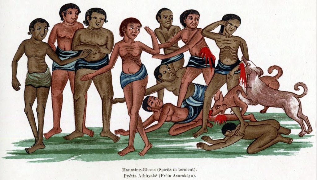 La verdad es que la India no es ajena a los folklores de espíritus anclados en asuntos terrenales. Ni reencarnan ni desaparecen ni ascienden ni ná. Aquí se quedan, muchas veces convertidos en demonios o al menos fantasmas puñeteros (los Bhoota). Las tradiciones mas primitivas pueden tener miles de años, y algunas danzas se han asignado hasta originarias del Calcolítico. Ahí es ná. Algunos fantasmas son finos gourmets (como los Mecho bengalías, que gustan del pescado, o la Bhaater Petni, que prefiere el arroz). A los espíritus de los antepasados se les hacen danzas rituales para adorarlos, que nada como la música y el baile para tenerlos contentos (a ellos y a montones de entes sobrenaturales)