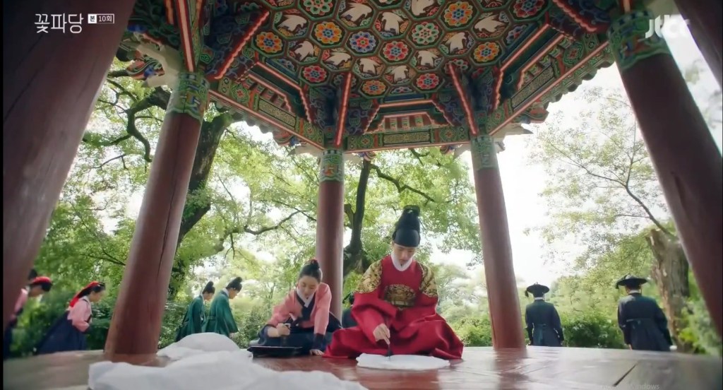 De rival de amores que si, que no, contamos con el antiguo herrero, hoy rey cabezota (Seo Ji Hoon, tiene poco CV, cachis, está muy riquiño). Intrigas palaciegas, bonita fotografía, buen fondo de armario con el vestuario, historias bien desarrolladas (cada chico de la agencia tiene su propia historia personal, para nada frívola, que esconde tras pañuelos de seda y abanicos)